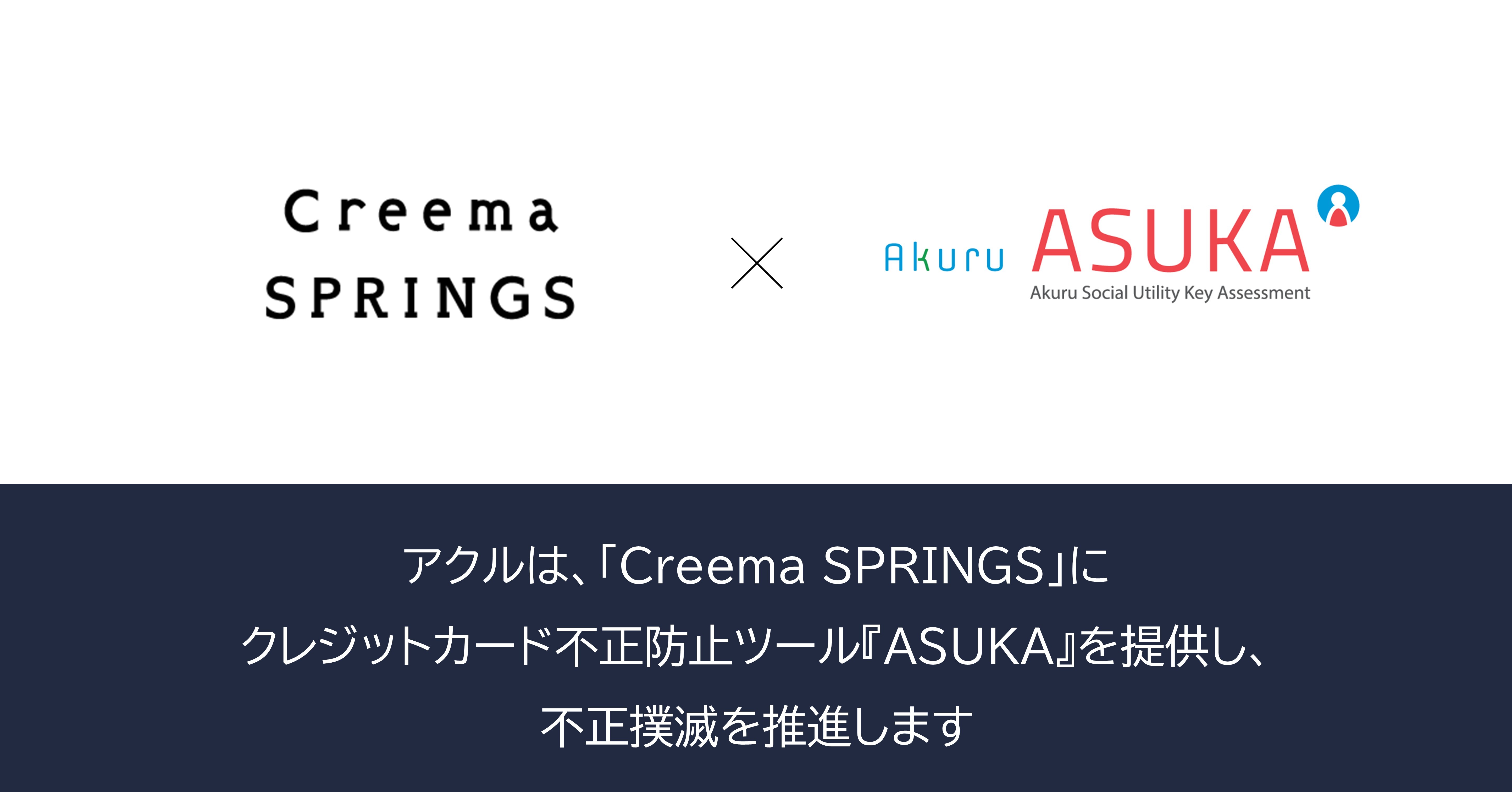 クレジットカード決済などの不正利用対策ソリューションを提供する株式会社アクル(本社:東京都港区、代表取締役社長:近藤 修、以下「アクル」)は株式会社クリーマ(本社:東京都渋谷区、代表取締役社長:丸林 耕太郎、以下「クリーマ」)が運営するCreema SPRINGSサイトへの不正検知・認証システム「ASUKA」の提供を開始しました。